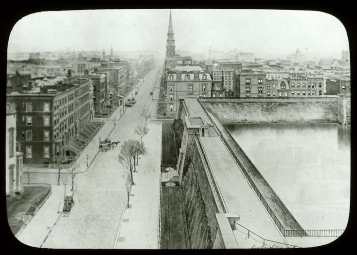 I’ll tell you here that I was ready to believe in every dark vision if it appeared at the Croton Holding Reservoir. Which is gone, of course. Our public library stands there now. But in those years its massive ivy-covered walls rose over a neighborhood monumental in its silence…. The few brownstones and marble mansions on Fifth Avenue stood aloof from the noisy commerce of the south. Our Mr. Tweed lived just a block north, practicing the same silence. It was an unnatural thing, the reservoir. The bouldered retaining walls were twenty-five feet thick and rose forty-four feet in an inward-leaning slant. The design was Egyptian. The corners were relieved by trapezoidal turrets, and bisecting each long wall face were temple doors. You went in, climbed up a stair to the parapet, and came out in the sky. From this elevation the rising city seemed to fall back before something that wasn’t a city, a squared expanse of black water that was in fact the geometrical absence of a city.