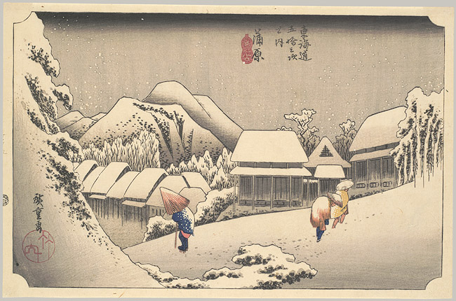 I first encountered Japanese woodblock prints – specifically those done in the traditional Ukiyo-e method – on a visit to the Museum of Fine Arts in Boston. Katsushika Hokusai’s (1760-1849) print The Great Wave Off of Kanagawa (part of the series 36 Views from Mount Fuji), has been reproduced on everything from mugs to t-shirts to calendars, and is probably the example most readers are familiar with. But my favorite artist of Ukiyo-e is Hokusai’s contemporary Utagawa Hiroshige (1797-1858). Hiroshige’s compositions are the more dynamic. His series One Hundred Famous Views of Edo pushes the limits of the medium and the two-dimensional plane.